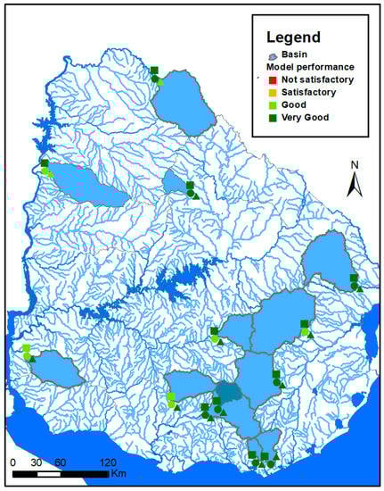 The agreement between measured and simulated hydrographs for all simulations was very satisfactory. In Figure 7, the statistical results of the individual calibration process at each selected watershed are represented. They follow the general performance ratings for adopted statistics by Moriasi et al. [] and Chen et al. [] reported in Table 7.