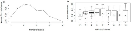 (a) Average silhouette scores. (b) Boxplot of silhouette scores (‘X’ represents the average).