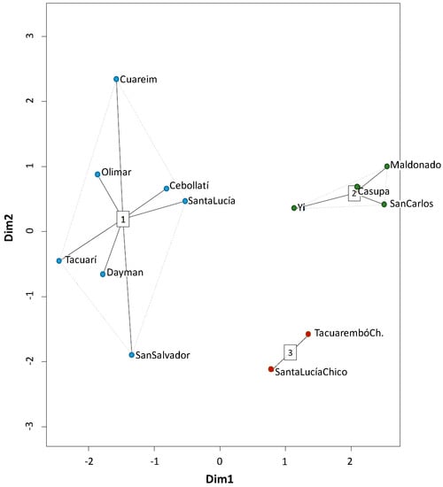 The PCA/k-means analysis was coded and run in R [], by using the libraries “cluster,” “HSAUR,” and “vegan.” The attributes considered were watershed area (km2), slope (%), concentration-time (h), and AD (mm), for considering the physical catchment characteristics; R-B index, and Dominant Q (m3/s/km2), for taking into account the hydrologic response. A data matrix (13 × 7) was the input for this HCA, being 13 watersheds and 7 attributes (6 basin characteristics + 1 basin identification). Prior to classification, the attributes (raw data) were mean-centered and scaled to unit variance to give equal importance to each attribute and to handle the different measurement units of attributes. After the normalization, all attributes had mean equal to zero and standard deviation equal to one. The first two principal components (PCs) or dimensions (Dim) were selected since they represented 72% of the variance. In Figure 9, the resulting PCA scores plot is shown. Each of the 13 watersheds is represented by a data point in the plot, and their location indicates the score of each basin for the PCs.