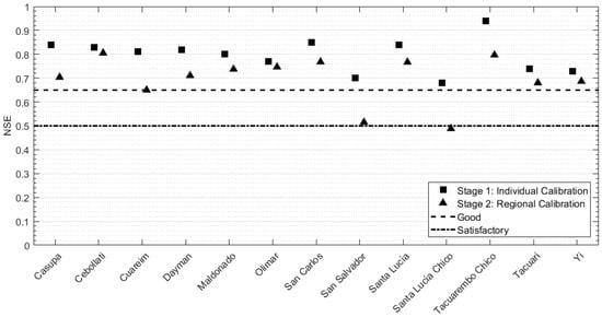 The improved regionalization method was tested at the acceptor basins. The streamflow prediction was then compared to the observed streamflow time-series at the pseudo-ungauged catchments. In Figure 10, the performance obtained at the individual calibration phase and regional calibration stage were evaluated by NSE. The numerical values for this final stage (regional model calibration) are reported in Table 9. Considering that in the 56 iterations, x2 and x3 were varying in the ranges [−1.5, −0.5] and [47, 67] respectively, it is worth remarking that the following outcomes correspond to the best values of x2 = −1.5 and x3 = 59.