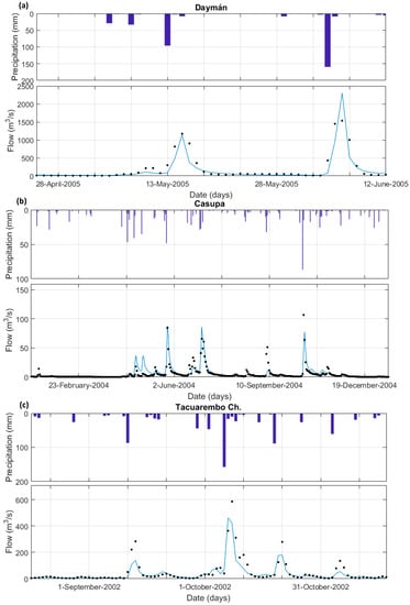 Comparison between observed (black dots) and simulated hydrograph (blue line) at (a) Dayman (centroid of k1), (b) Casupa (centroid of k2), and (c) Tacuarembo Chico (centroid of k3) watersheds.
