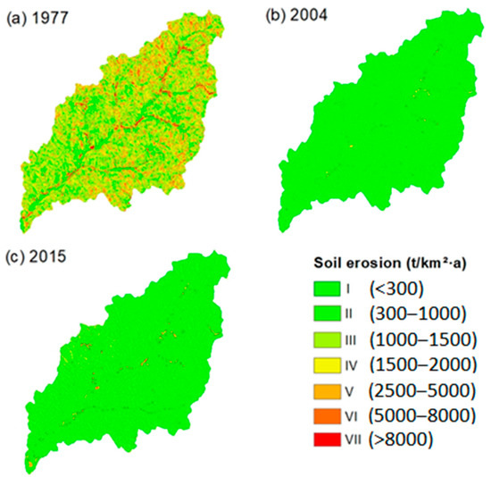 Soil erosion distribution in the JYG watershed in (a) 1977, (b) 2004 and (c) 2015.