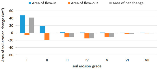 In this study, we drew an area change histogram plot of different soil erosion intensity grades to illustrate the conversion of soil erosion intensity more visually (Figure 3), we could find that the area of soil erosion that converted from other grades to grade I from 1977 to 2015 (area of flow-in of I) was the largest, which occupied 69.3% of total change area from 1977 to 2015, followed by another grade that converted to grade II (area of flow-in of II), which accounted for 26.83% of the total change area. Specifically, many parts of grade II, III, IV and V were transferred to grade I, which accounted for 35.78%, 18.24%, 20.47% and 10.98% of the total area change, respectively. Noting that the soil erosion area of grade VI and VII just accounted for 3.79% and 2.14% and 0.31% and 0.14% of the total soil erosion in 1977 and 2015, it indicated that the transfer proportion of grade VI and VII to grade I was still large in the whole study period.