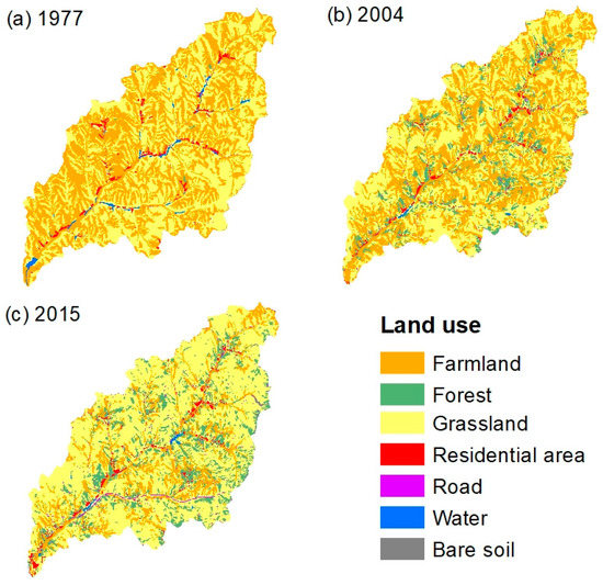 The spatial distribution of different types of land use on the JYG watershed in 1977, 2004 and 2015 are shown in Figure 4. Evidence shows that the main land uses type were farmland and grassland in the JYG watershed, and it had a great change with a decrease in farmland and increase in grassland from 1977 to 2015. Table 5 depicts the average soil erosion modulus and average vegetation covers corresponding to the different land uses type in 1977, 2004 and 2015. The results show that the rate of change of soil erosion for different land use in a decreased order from high to low as: forest > residential area > road > farmland > grassland. The area of farmland was declining in recent years, which decreased from 47.97% to 16.59% of the total study area. This change played an important role in helping to relieve the soil erosion in the basin, which showed a reduction trend from 1195.89 to 164.81 (t/km²·a). Although the area of forest was small in the basin, its soil erosion reduced significantly, from 1029.95 to 288.01 (t/km²·a) with a 27.96% change rate. The grassland is the main land use type with a moderate and low vegetation cover in the study area. Therefore, the soil erosion of grassland was higher compared with that of forest and farmland. Noting that the road and residential area also presented the large soil erosion in the basin, which was 8838.77 (t/km²·a) and 11,262.8 (t/km²·a) in 1977 respectively.