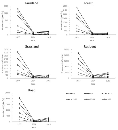 Different slope and soil erosion intensives had a close relationship under the same land uses type in the JYG watershed from 1977 to 2015. Figure 5 shows these relationships and indicates that the soil erosion became more serious with the increase of slope gradients under the same land uses. Especially from 1977 to 2004, soil erosion decreased significantly with the slope increases and since 2015, this trend of increase gradually became slow. Additionally, under different land use patterns, soil erosion also presented the same regularity with the increase of slope, that is, decreased drastically first and then increased slowly or remained stable.
