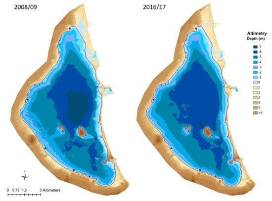 | Isobath (m) | Surface Area (2008) (km2) | Vol (2008) (109 m3) | VT (2008) (109 m3) | Surface Area (2016) (km2) | Vol (2016) (109 m3) | VT (2016) (109 m3) |