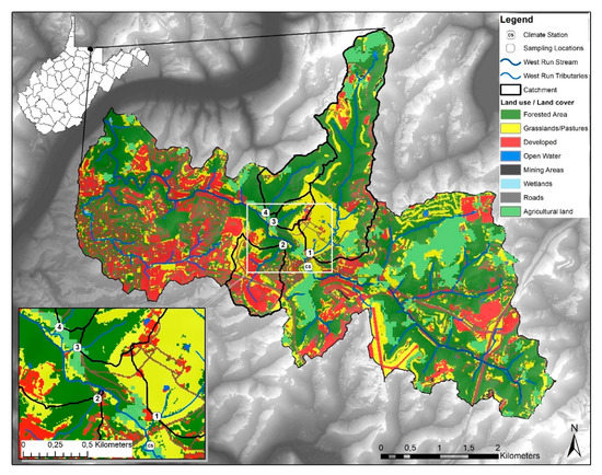 Figure 1. Monitoring/sampling locations for the current investigation, with land use/land cover, in West Run Watershed, Morgantown, West Virginia, USA.