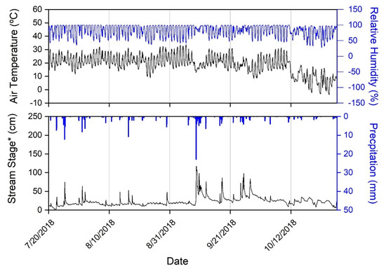 Figure 2. Thirty-minute time series of climate variables (recorded at the climate station) during study period (20 July 2018–27 October 2018) in West Run Watershed, West Virginia, USA. * Note: Stream stage was monitored in the primary stream of WRW, West Run Creek, within approximately 100m of the confluence of Site #1 and West Run Creek (39°40′3.20′′ N 79°55′48.99′′ W).
