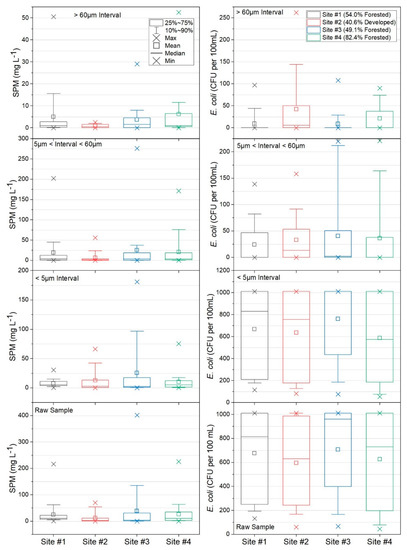 Box and whisker plots reflecting descriptive statistics of SPM (mg L−1) and E. coli concentration (CFU per 100 mL) are provided in Figure 3. In the >60 µm interval, Site #2 (40.6 % developed) had both the smallest SPM concentration range (0–2.5 mg L−1) and the largest E. coli concentration range (0–262 CFU per 100 mL). However, in the 5 to 60 µm particle size class, Site #4 (82.4% forested) had the largest SPM concentration range (0–171.5 mg L−1), whereas Site #3 (49.1% forested and 42.1% agriculture) had the largest E. coli concentration range (0–276 CFU per 100 mL). In the <5 µm interval, Site #3 had the highest SPM (0–181 mg L−1) and E. coli concentration values (0–1011 CFU per 100 mL), while Site #1 (54% forested) had the lowest SPM concentration range (0–30.5 mg L−1) and Site #4 (82.4% forested) generally had the lowest E. coli concentration values. The raw (unfiltered) samples had a similar distribution to the <5 µm interval, with Site #3 again featuring the highest SPM (0–402 mg L−1) and E. coli concentration values (0–1011 CFU per 100 mL). Similarly, Site #1 (54% forested) comprised the lowest SPM concentration range (0–216 mg L−1); however, Site #2 generally had the lowest E. coli concentration values (Figure 3).