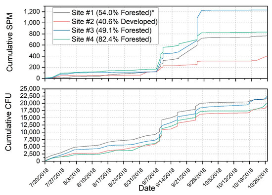 At the time of this study, Site #3 (Table 1) had the highest percentage of agricultural land use among the study sites (42.1%) and comprised the greatest cumulative SPM (1232 mg L−1) (Figure 4). The cumulative SPM recorded at Site #3 was more than three times the cumulative SPM recorded at Site #2 (40.6% developed), which had the lowest cumulative SPM (391 mg L−1). Previous studies investigating land use practices and SPM also recorded elevated levels of SPM in agricultural land use areas, thereby supporting the results from Site #3 [55]. The flattened cumulative curves (Figure 4) from 28 September 2018 to 19 October 2018 reflect a lack of sample collection during a period of negligible rainfall (and thus runoff; see Figure 2). Cumulative E. coli was the highest at Site # 1 (21632 CFU per 100 mL) and Site #3 (22641 CFU per 100 mL) during the sampling period (20 July 2018–27 October 2018) (Figure 4). These two sites drained the highest (42.1%; Site 3) and second highest (31.8%; Site #1) area of agricultural land use practices among the sampled sites (Table 1). The results are supported by previous work that showed increased fecal matter content with agricultural land use practices [53,56]. Conversely, Site #2 and Site #4 had the lowest cumulative E. coli CFU (19082 CFU per 100 mL and 20080 CFU per 100 mL, respectively) during the study period. Site #4′s low cumulative E. coli CFU was anticipated, as this site consisted primarily of forested land use (82.4%) (Table 1) and previous work showed negative correlations between fecal concentration and forest land cover [56]. Furthermore, Site #4 lacked artificial sources of E. coli (e.g., livestock manure stacks present at Site #3), which could have increased the E. coli concentration in its receiving waters. The low cumulative E. coli CFU recorded at Site #2 is contrary to results from previous work linking urban land use practices to increased E. coli concentrations in receiving waters [57,58,59]. Given the differing study design (sampling regime) relative to other studies, these differences are not confounding. It is, however, worth noting that in cases where the current study agreed with previous studies, those agreements are important, given the different sampling regime and yet agreement(s) in results.