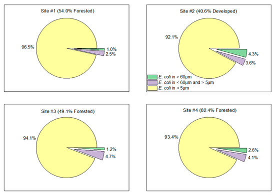 Figure 5. Fractions of E. coli concentration (CFU) in three filtered size intervals, at four monitoring sites during the study period (20 July 2018–27 October 2018) in West Run Watershed, Morgantown, West Virginia, USA.