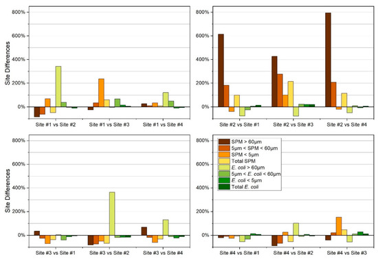 Figure 6. Suspended particulate matter (SPM) and E. coli concentration percent difference, separated into filtration intervals (<5 µm; 5 µm < interval < 60 μm; and >60); and total, at four monitoring sites during study period (20 July 2018–27 October 2018) in West Run Watershed, Morgantown, West Virginia, USA.