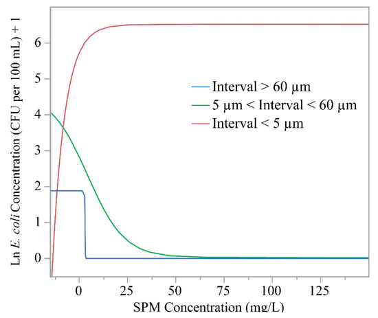 Increasing SPM concentrations in the intermediate (5 μm < interval < 60 μm) or large (>60 μm) intervals did not result in similar increases to the corresponding E. coli concentration (Figure 7). However, increased SPM in the smallest interval (<5 µm) had corresponding increases in the E. coli concentration in this interval. This result was attributed to bacteria becoming predominantly attached to, and subsequently transported with, SPM in the smallest interval (<5 µm), a relationship shown preliminarily in previous investigations [66,67,68]. This relationship may also be a function of the similar transport physics of E. coli and SPM particles <5 µm in size, due to similar sizes and buoyancy [69]. In general, this relationship supports the likelihood of E. coli remaining in suspension for longer time periods, thereby increasing the stream areas affected by fecal contamination.