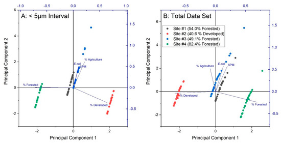 Principle component analysis (PCA) showed that the components that account for the maximal variance within a given data set can be identified through the computation of multiple principal components and their respective eigenvalues [70]. Eigenvalues represent the variance of the data in a given direction, therefore components with the highest eigenvalues are principal components [70]. However, most data cannot be well described by a single principal component [70]. Therefore, multiple principal components are typically computed and ranked based on their eigenvalues and displayed visually with biplots [70]. In the current work, principle component biplots showed a distinct spatial distribution of study sites along principal components 1 and 2 for both the smallest interval (<5 µm) and the total data set (defined as all he SPM and E. coli data >0.7 µm) (Figure 8). Both biplots highlight the grouping of each of the sites within the idealized vector space defined by principal components 1 and 2. Given the similarity between the sites in terms of geology, topography, and climate, and their close proximity to each other, it can be concluded that the varying land use practices are the principal factors influencing the grouping of the data observed in both biplots [34]. The most obvious patterns are the strong correlation between E. coli concentration and SPM concentration in both the smallest interval and total data set (Figure 8). Ultimately, the percentage of agriculture land use was most closely associated with both E. coli and SPM concentrations, particularly in the smallest interval, attributable to reasons presented earlier [53,55,56]. This result further emphasizes that agricultural land use practices are strongly correlated with not only the occurrence of fecal contamination [35], but potentially the persistence of fecal microbes in receiving water. Conversely, forested and developed land uses were not as closely correlated with E. coli or SPM concentrations (Figure 8). Ultimately, PCA analysis (Table 2) and biplot results (Figure 8) effectively illustrate spatially the relationships between E. coli concentration, SPM and land use practices.