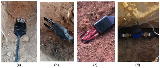 Figure 2. (a) Soil matric potential sensor MPS6. (b) Soil water content sensor 10HS. (c) Soil water content, temperature, and electrical conductivity (EC) sensor 5TE. (d) Water flow meter device JS04. - (2)
