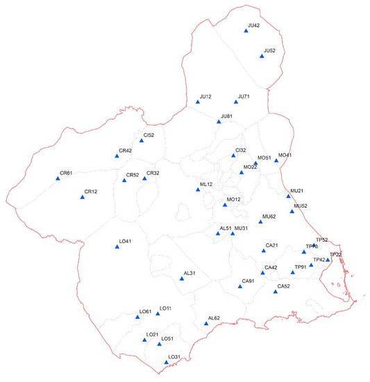 Information about weather conditions is provided by the IMIDA (Instituto Murciano de Investigación y Desarrollo Agrario y Alimentario, 30150 Murcia, Spain). This public research institution has deployed a network with 49 climatic stations that cover the region of Murcia (SIAM) [43] (Figure 3).
