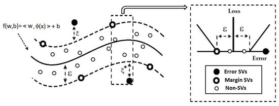 In Equation (4), denotes the vector of input features, k the number of features, the vector of parameters to be estimated, and b the position parameter to be estimated. The vector of parameters represents the flatness or simplicity of the function. SVM generalization to SVR is accomplished by introducing an ε-insensitive region around the function, called the ε-tube, in such a way that observations , which lie inside the tube, lead to null errors.