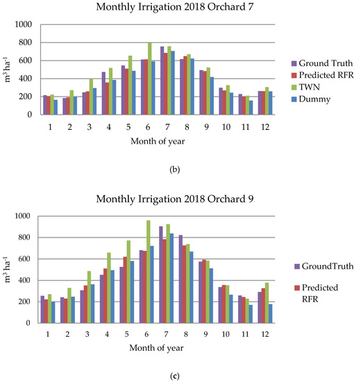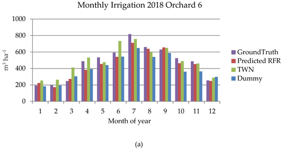 Figure 5 and Table 4 analyze the water requirement per month for the RFR model, the dummy model, the TWN, and the GT (ground-truth) during the year 2018 and for three of the orchards. Although all nine plots were used for the model training and error comparison phases, a comparative representation of the goodness of the models with respect to GT (agronomist reports) was made for those plots for which full years of data were available, Orchards 6, 7, and 9. In this case, the relative error (RE), given in Equation (10), was used to evaluate the monthly accuracy for each prediction method: