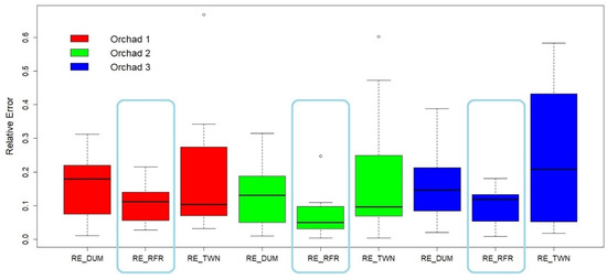 Regarding the water applied, we can conclude that considering only the TWN for irrigation wastes water (an increment of 282, 722, and 1049 m3 ha−1 per year for Orchards 6, 7, and 9, respectively) compared to the agronomist. In contrast, the dummy estimator tends to heavily underestimate the water requirements (with underestimates of 766, 404, and 393 m3 ha−1 for Orchards 6, 7, and 9, respectively). However, the RFR model performed much better than the others (408, 248, and 7 m3 ha−1) with errors below 12% for all the orchards and weeks.
