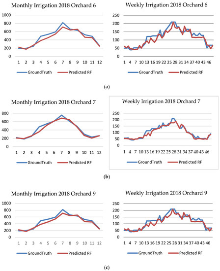 In Figure 8, we can see that the monthly and weekly RFR prediction follow quite precisely the tendency of the GT for all months and weeks in each one of the three orchards tested.