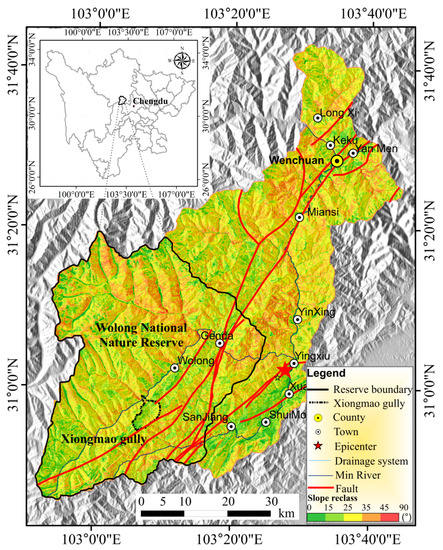 On 12 May 2008, Yinxiu, a town in Wenchuan County, located on the fault zone of Longmen Mountain, was hit by a Richter 8.0 earthquake. The straight-line distance of the study area to the epicenter was 32.3 km (Figure 1). The earthquake heavily damaged the buildings and infrastructure of Wolong town in Wenchuan County, and loosened the mountain surface, resulting in collapse and landslide and providing abundant loose sources for the debris flow.