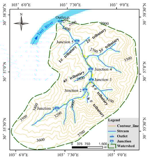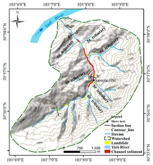 The catchment consists of carbonaceous phyllites, sandy phyllites, slates, and crystalline limestones. The upstream topography of the gully is U-shaped and the vegetation consists mainly of shrubs; the downstream valley is roughly V-shaped, with steep slopes on both sides and well-developed cliffs with gradients of 50°–70°. The channel sediment (red areas in Figure 2) in the midstream and collapse accumulation (yellow areas in Figure 2) in the upstream represented the majority of solid material; midstream erosion was located on the red areas, and the main initiation thus occurred along Tributary 6 and Tributary 5.