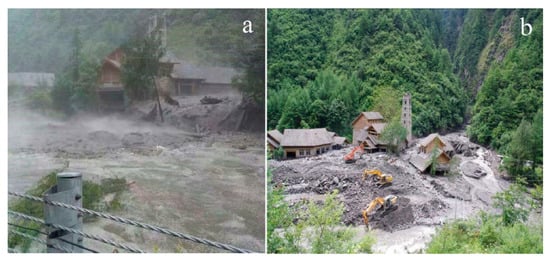 Photo of the scene of the debris flow on 26 July 2016: (a) the outbreak of the debris flow before blocking of the main river; (b) emergency drainage of the debris flow which has dammed the river.