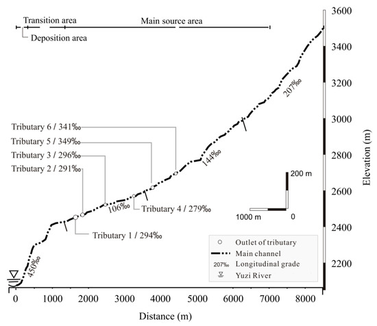The longitudinal profile of Xiongmao Gully revealed that the whole gully gradually slowed due to the reduced upstream longitudinal gradient from the original 207‰ to 106–144‰. In particular, the reduced longitudinal gradient of the original area led to the debris being readily deposited and decreased the debris flow velocity. At the downstream transition area, the longitudinal gradient became abrupt, reaching a maximum of 450‰, which drove an outrush of debris into Yuzi River (Figure 4).