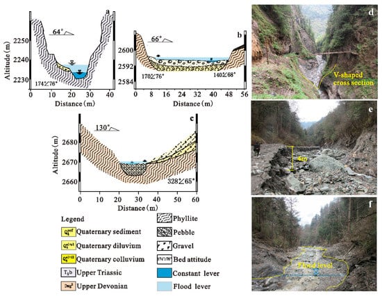 Xiongmao Gully can be divided into source area and transition and accumulation zones. Figure 5a,b shows cross-sections of the upper and lower parts of the transition zone, while Figure 5c shows it through the source area. Photos of the transition zone with a deep gully, the sediment initiation area, and flood flow area are shown in Figure 5d–f, respectively.