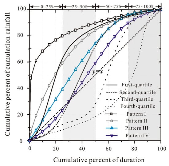 Typical curve of cumulative rainfall duration; first-quartile, second-quartile, third-quartile, and fourth-quartile stand for a 50% probability level for Huff curve, corresponding to four kinds of curves in the K-value clustering analysis of the data from the observation stations.