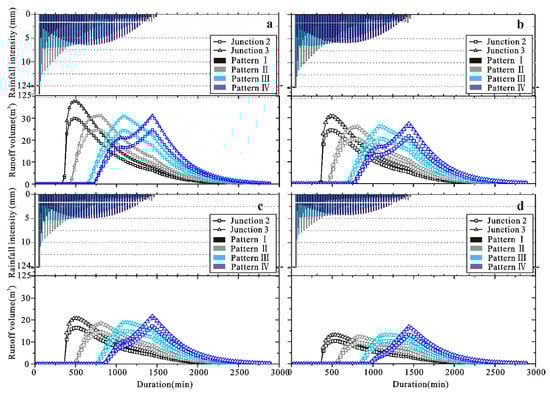 Compared to the water volume curve in Xiongmao Gully, the lower part of Figure 8 shows hydrographs at different junctions for different rainfall return periods and rainfall patterns. The rainfall frequencies influenced the flow volumes, and it was found that the peak discharge was influenced by the rainfall patterns. The time at which the peak flows of Pattern I, II, III, and IV emerged were after 480~510 min, 780~810 min, 1080~1110 min, and 1410~1470 min, respectively. However, as shown in Figure 8d, the peak flow for a frequency of 10% appeared a little later and lasted for a longer time, indicating that the storage capacity of the vegetation and soil in the catchment retarded and decreased the peak flow.