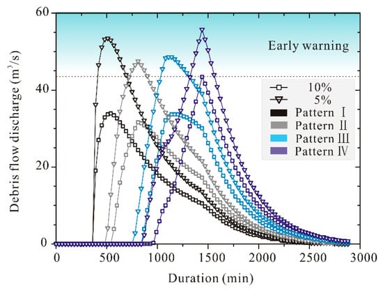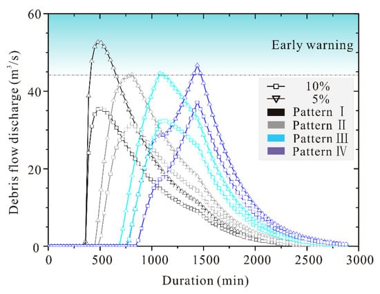 As indicated in the critical discharge analysis, the rainfall conditions led to the outbreak of a debris flow on 26 July 2016; except for the catchment topography and source distribution, the prediction of the rainfall conditions under which debris flow could happen was the aim of this study. The debris flow discharges at cross-section B-B’ under rainfall conditions at frequencies of 10% and 5%, calculated using Equations (1) and (2), are shown in Figure 10, and it can be seen that debris flow was almost impossible in Xiongmao Gully at the frequency of 10%, while debris flow was more likely under the four rainfall patterns at the frequency of 5%.