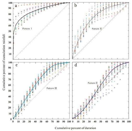 The scatter diagram of rainfall patterns. Four kinds of rainfall patterns including (a) Pattern I, (b) Pattern II, (c) Pattern III, and (d) Pattern IV according to K-value clustering analysis.