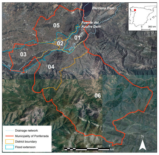 The proposed method is applied in the urban area of the Ponferrada nucleus, a city that belongs to the municipality of the same name, which is located in the province of León (northwest of the Iberian Peninsula) (Figure 1). The municipality of Ponferrada has a total of 67,367 inhabitants distributed in 37 population nuclei. Its capital, Ponferrada, which is located on the banks of the River Sil and its affluent, the Boeza River, is the seventh-largest city of the Castilla y León region by population, with 41,858 inhabitants. It is the centre of the most important services of Bierzo County, including the district hospital, university, and regional authority. According to the population census [], the municipality is distributed into 6 districts or demarcations. Each district is subdivided into different census sections. In total, the city is subdivided into 45 census sections, each of which averages approximately 1500 persons within the range of 625–2780 inhabitants.