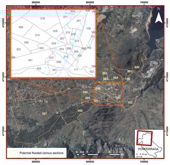 Of the 45 census sections, the study focuses on only 37. The eight rejected census sections coincide with sections outside of the perimeter of the flood area or those inside the perimeter but in which no urban parcels are affected. This perimeter is estimated based on break-dam modelling of the dam []. From these 37 sections, the assignation of data is extrapolated from neighbouring sections in the other eight census sections. The main reason for this assignment was the coincidence of two situations: on the one hand, the affected extension of the section was small; on the other hand, the affected urban parcels were closer and had social characteristics more similar to those from the neighbouring section than to those from their own section.