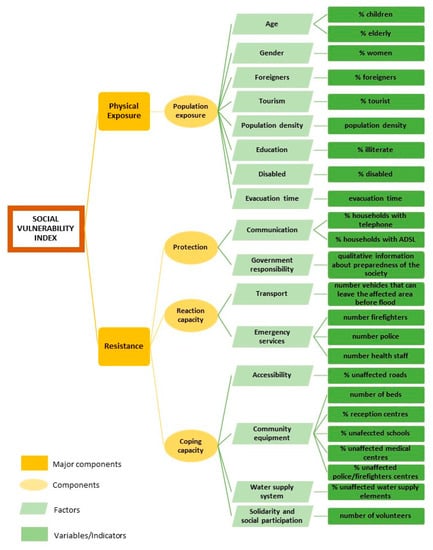 We perform a simplification exercise in this work and summarize the factors that affect social vulnerability into two major components: (i) the physical exposure of the individual/population/community to flooding; and (ii) resistance, which includes a set of minor components such as protection, reaction capacity and coping capacity [].