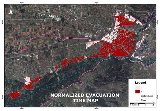 The evacuation time is an indicator that measures the relationship between citizens’ velocity of displacement and the time of arrival of the flood water. Until now, this indicator has only been used for emergency management, and very few studies have included it to define vulnerability []. Its importance is that it establishes a very clear threshold between those areas where there is a possibility of social recovery and those in which such recovery is impossible. The latter correspond to areas in which the evacuation time is greater than the time of arrival of the water wave.