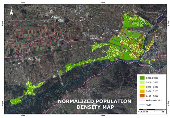 The areas of higher population density represent areas of higher exposure to a hazard and areas where evacuation may be more difficult, so they are very vulnerable. Although this is a relevant indicator, the personal protection data law remains the main impediment when estimating its value. For this reason, population data are only available at the census section level in open sources. To spatially disaggregate these data, it is necessary to estimate the number of dwellings in each urban parcel. This calculation is possible through the attribute database linked to the cadastral parcel layer, where it is possible to estimate the amount of properties targeted to residential use based on a unique reference cadastral identifier. The population registered in a census section is distributed homogeneously among all dwellings belonging to the same census section.