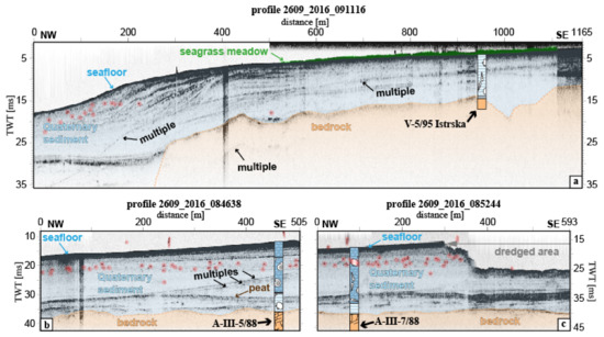 - Novak, A.; Šmuc, A.; Poglajen, S.; Vrabec, M. Linking the high-resolution acoustic and sedimentary facies of a transgressed Late Quaternary alluvial plain (Gulf of Trieste, northern Adriatic). Mar. Geol. 2020, 419, 106061. [Google Scholar] [CrossRef]