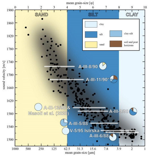 - Orsi, T.H.; Dunn, D.A. Correlations between sound velocity and related properties of glacio-marine sediments: Barents sea. GeoMar. Lett. 1991, 11, 79–83. [Google Scholar] [CrossRef]