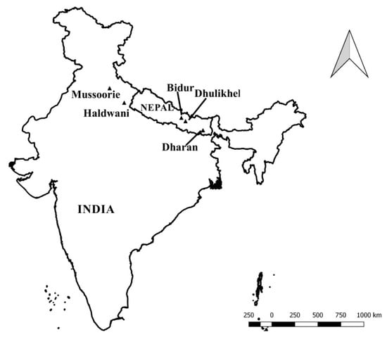 The region where we conducted case studies stretches from the eastern Himalayas in Nepal to the Western Himalaya in the Indian state of Uttarakhand. A city has been taken as the unit of study to understand water insecurity. The cities in the case study represent diverse categories found in the Himalayan region—hilltop touristic cities (Dhulikhel and Mussoorie), foothills commercial cities (Bidur, Dharan, and Haldwani) (See Figure 2 for the locations of the case study cities). The region is internally diverse, both geographically and in terms of social and economic situations, and our five case studies in no way provide a full picture of the region. Small and medium, mountainous and foothill cities are common in the Himalayan region of India and Nepal. Hill top towns are popular tourist destinations, whereas, foothill towns are major trading gateways for the mountain people. As highways are being constructed or expanded across river valleys, there is an increasing trend of hilltop communities moving down to the new urbanizing settlements in the valley floor, as found in Bidur, Dharan, and Haldwani. Despite such diversity, the selected cases do provide fairly representative picture of water insecurity in the region, as well as illustrating the diverse ways in which cities respond to the challenges of water insecurity.