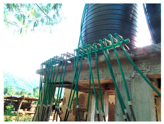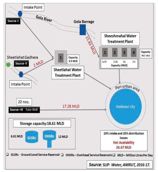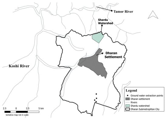 The city’s history of water supply development dates back to 1961 when British Army Engineers constructed the first piped water supply system by tapping water from two ephemeral rivulets—Sardu and Khardu—flowing down right next to the city. The system was later managed by Dharan Municipality, before it was finally handed over to the government-owned Nepal Water Supply Corporation (NWSC) in 1982. NWSC expanded its system in the late 1980s by extracting groundwater (for details of water sources, see Figure 4), but with the continuous increase in demand, the supply has been far from adequate. Currently, the Sardu and Khardu system meet only one-third of the town’s water need (NWSC collects 12 to 13 MLD in wet season and 4 to 4.5 MLD in dry season from both Sardu and Khardu Kholas [30], and the supply volume further diminishes during the dry season. Although about 98% of Dharan households are connected to the water supply grid, the supply is confined to rainy season with the intermittent supply of largely unsafe water [23]. Worse still, the supply hours are reduced drastically during the dry season with most of the areas receiving water for only two hours daily. Moreover, not every suburb receives an equal amount of water. The areas at the far end of the distribution system receive much less supply. In some cases, public agencies have filled water access gap in the marginal areas by providing public taps (For example, NWSC and the Municipality have provided some levels of service to the poor). One of the four priority areas identified in the city water forum meeting held on 3 August 2016 was Squatter’s limited access to water services.