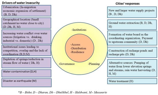 While Himalayan-wide studies highlight general trends of water flow under the changing climate, there is a notable lack of studies of city scale water insecurity situations and responses made by the city level institutions in the Himalayan towns. Considering this gap, we conducted action research with five caste study towns to understand town-specific water insecurity challenges, and then also to test collaborative approaches to tackle these challenges. Our research captured in this paper was guided by the question: What forms of water insecurity are the lower Himalayan cities experiencing and how are these cities responding to the challenges? Our aim was not to test a specific theoretical model of water security but to identify and assess the actual water insecurity situations and city level responses to tackle the challenges. Our point of departure was that cities’ responses to water insecurity could involve investment of resources, formulating plans, creating or adapting institutional arrangements, adopting a new technology in water management, or even reconfiguration of roles among actors (See Figure 1 for the elements we cover in this paper). Water security as an outcome should also capture broad dimension of access, equity, and resilience in relation to climate impact. In view of the limited studies of urban water systems in the region, our focus was not to present a comparative analysis of the case studies but to showcase the five different city level stories of water insecurity, and the cities’ struggle in overcoming it. The main contribution of this paper is to show how different types of Himalayan towns (hilltop, foot hill, river side, water stressed, touristic, and trading hub) are struggling to secure water for their residents, tourists, and the infrastructure, despite the region receiving significant amounts of annual precipitation. We also identify key themes and issues in relation to urban water insecurity in the Himalayas. Other aspects of analysis of water insecurity challenges from these case studies have been reported in other papers which were the outcomes of the research project on which this paper is based [20,21,22,23].