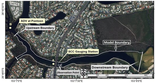 Aerial view of Currimundi Lake catchment, main channel including ADV and drifter’s deployment locations, model boundary, observation point (C) and tidal gauge station; (map is created using ArcGIS software by Esri). Drifters were deployed at point A and retrieved at point B.