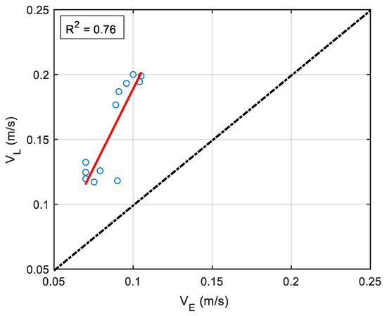 Cross stream velocities of the drifters (VL) and the ADV (VE) were rather poorly correlated with the drifter velocities larger than ADV velocities (Figure 4). Some of the disagreements between Eulerian velocity (VE) and Lagrangian velocity (VL) may be related to: (i) The difference in Eulerian and Lagrangian instrument sampling location: the ADV measures water velocity 0.5 m below the surface while the drifters measure surface velocity. Because water profiles in wide open channels follow power law functions, we corrected the ADV velocities by applying a power law for uniform equilibrium flows in a wide-open channel. (ii) The difference in sampling volumes: the small sample volume of the ADV responds faster to the underlying flow field compared to the larger sample volume of drifters, which acts as a filter and is not able to capture small fluctuations. The small control volume of ADV impairs the insight into spatial structures and dynamics of the flow [49,50] and requires the application of considerable units of ADV [51]. (iii) Wind-induced surface flow effects on the drifters: drifters are more responsive to the surface flow velocities induced by the wind while the ADV captures the velocity of subsurface layers. (iv) Wind-induced slip of the drifters: approximately 30-mm unsubmerged height of each drifter is exposed to direct wind drag resulting in the horizontal motion of the drifter, which is dissimilar to the current motion [52]. The wind effect could impact the path and velocity of the drifter. This effect could not be eliminated and should be considered in drifter applications particularly in low velocity environments.