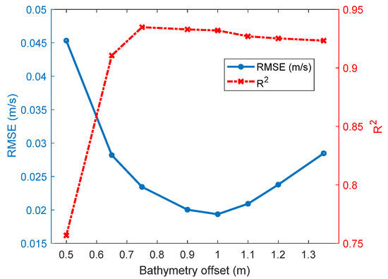 Root-mean-square error (RMSE) and R2 variations against variation in bathymetry values show the optimum bathymetry offset.