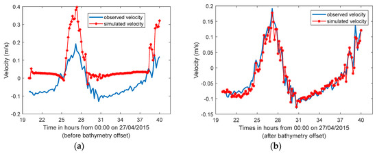 Observed vs. simulated velocities (a): before 1 m bathymetry offset and (b) after 1 m bathymetry offset.