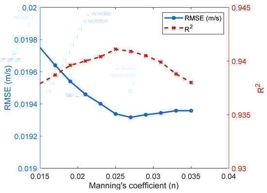 The result of the optimization is presented in Figure 8. The minimum RMSE (0.0193) was obtained at n = 0.027, while the R2 value reached a maximum (0.941) at n = 0.025. Based on the range of variation for both RMSE and R2 values, a Manning’s coefficient equal to 0.025 was selected as an optimum. Simulated and observed velocities were compared when n = 0.025 was applied. When comparing RMSE and R2 with n = 0.023 after optimum bathymetry offset (Figure 5), some improvement in the model resulted (Figure 8). Figure 9a and b shows a good agreement and correlation between simulated and observed velocities at n = 0.025, respectively, with 70% of the data.