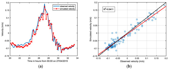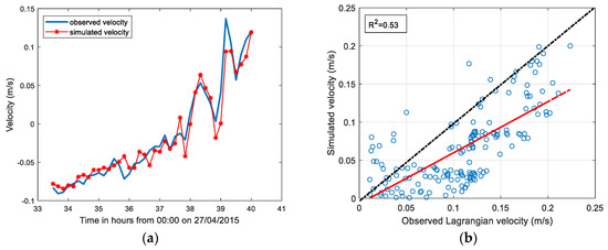 (a) Eulerian validation of the model by comparing the simulated and observed velocity using 30% of the data; (b) relationship between observed Lagrangian velocity and simulated velocity.