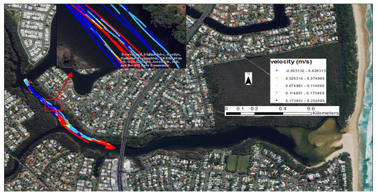 The temporal variability of mean horizontal velocity measured by the ADV is presented in Figure 3. A 200 s interval moving average was applied to the entire dataset; the moving average interval was chosen based on work by Chanson et al. [46] in a similar estuary. The surface water velocity collected by drifters during the experiment covered an area from 1000 m downstream to ~200 m upstream (from A to B in Figure 1) of the fixed instrument (ADV).